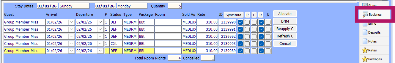 - Allocate: Auto allocates rooms to the individual reservations