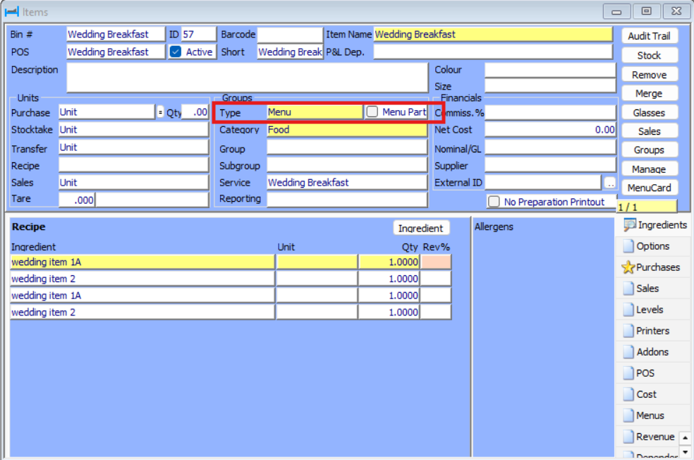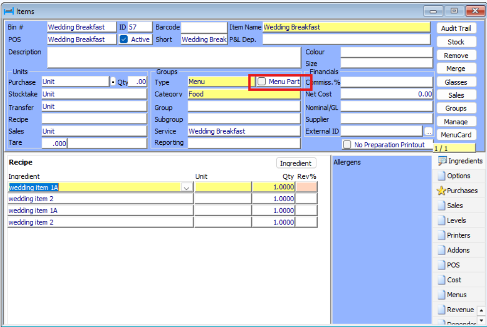 Next, add your menu items in the same way, (create a new items for each selection or course on your menu) but under the Type field, choose Product and tick Part of Menu.