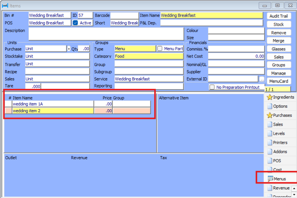 Navigate to Materials > Items and Free type the name of your function menu in the Name field. Add a description of the menu in the Description field, choose Menu in the Type field, and category food in the Category field. Now save.