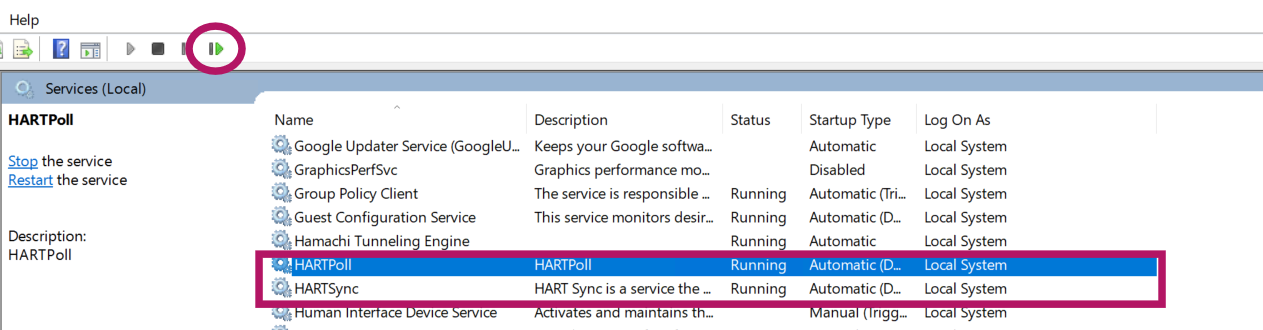 To re-start the services within the Windows Services panel locate the services and individually click the restart button circled: