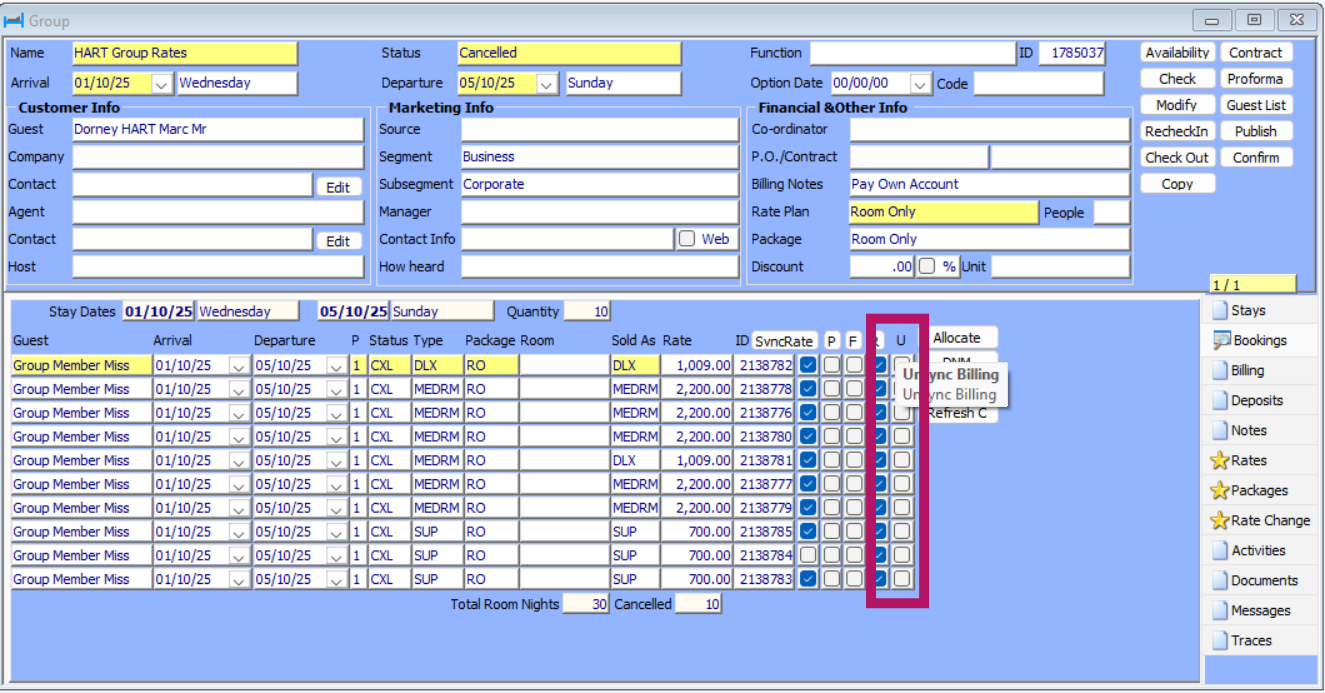 Where a group billing is set to anything other than 'Pay Own Account' then it may be wished that a specific room has the Pay Own Account billing instruction so room rates stay on the billing of that room at Close Day. To achieve this the 'U' tick box should be ticked in Groups > Bookings. This will unsync the room from the group from a billing perspective only. Following this the billing on the individual room should be updated to Pay Own Account