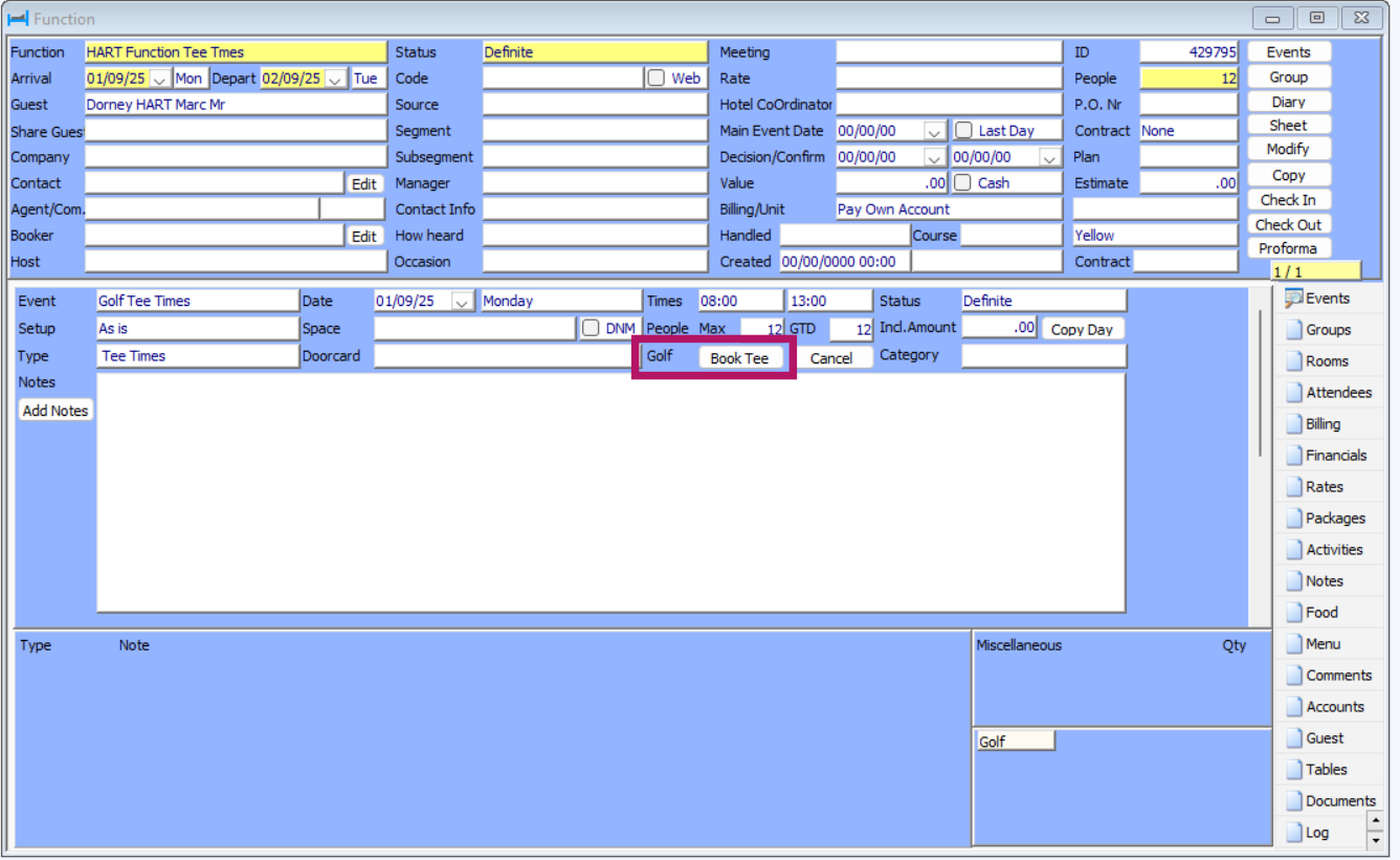 Via the Book Tee button on event lines of functions it's possible to make an initial tee time reservation connected to a function. Please note this tool is intended as a quick way to create tee times with management largely taking place via the golf diary.